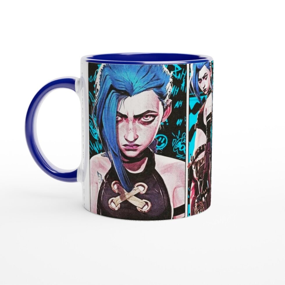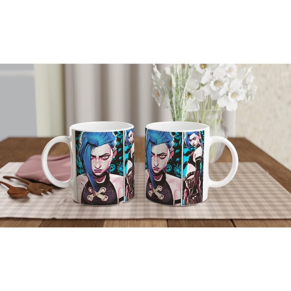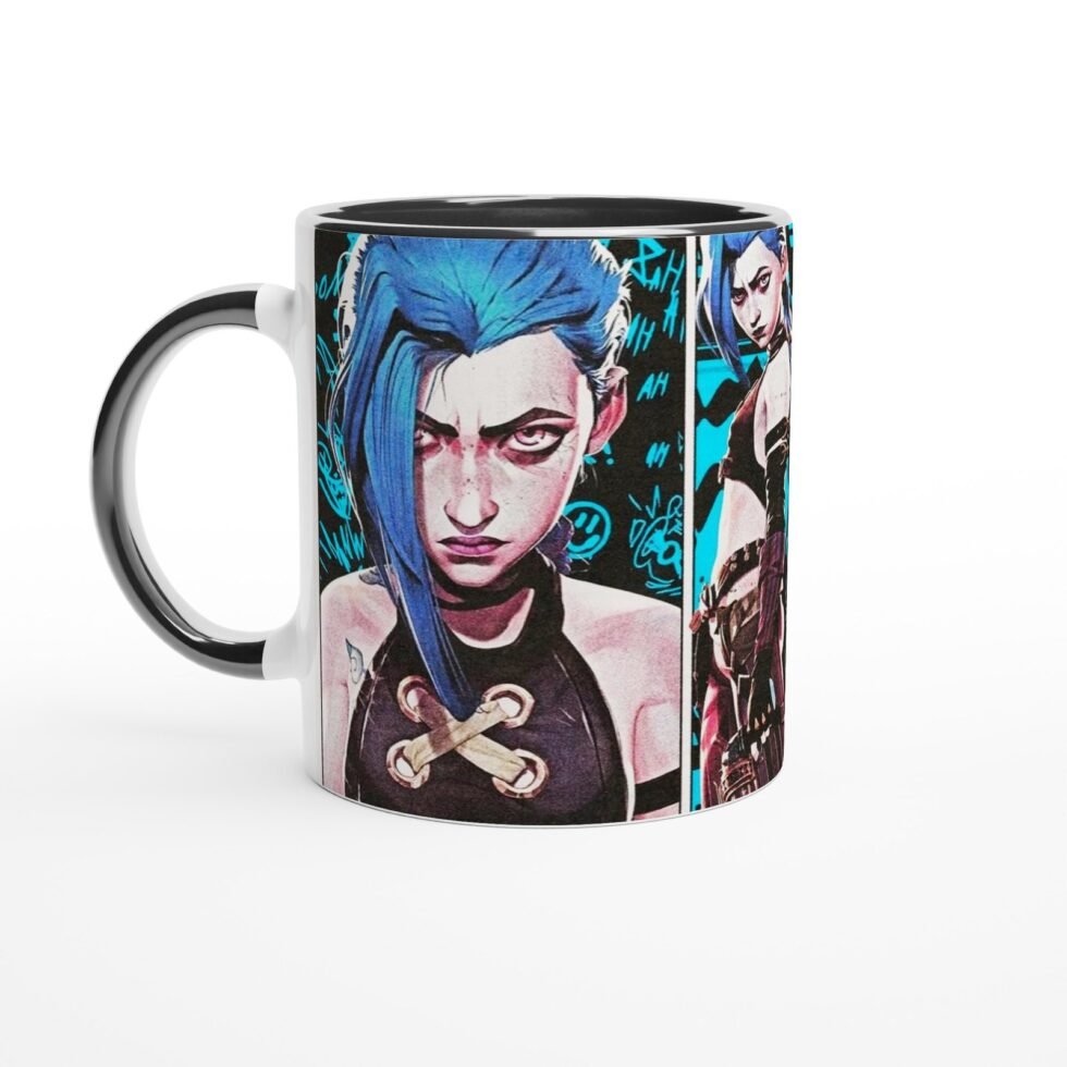 The collage approach gives the illustration an editorial quality, as if different moments, moods, and impulses were assembled into a single visual narrative. The composition carefully balances chaos and structure, capturing energy and movement without becoming overwhelming. This Jinx collage art mug feels expressive and intense, yet clearly intentional in its design.