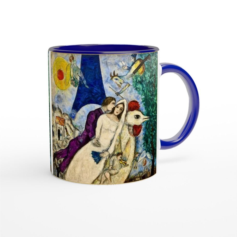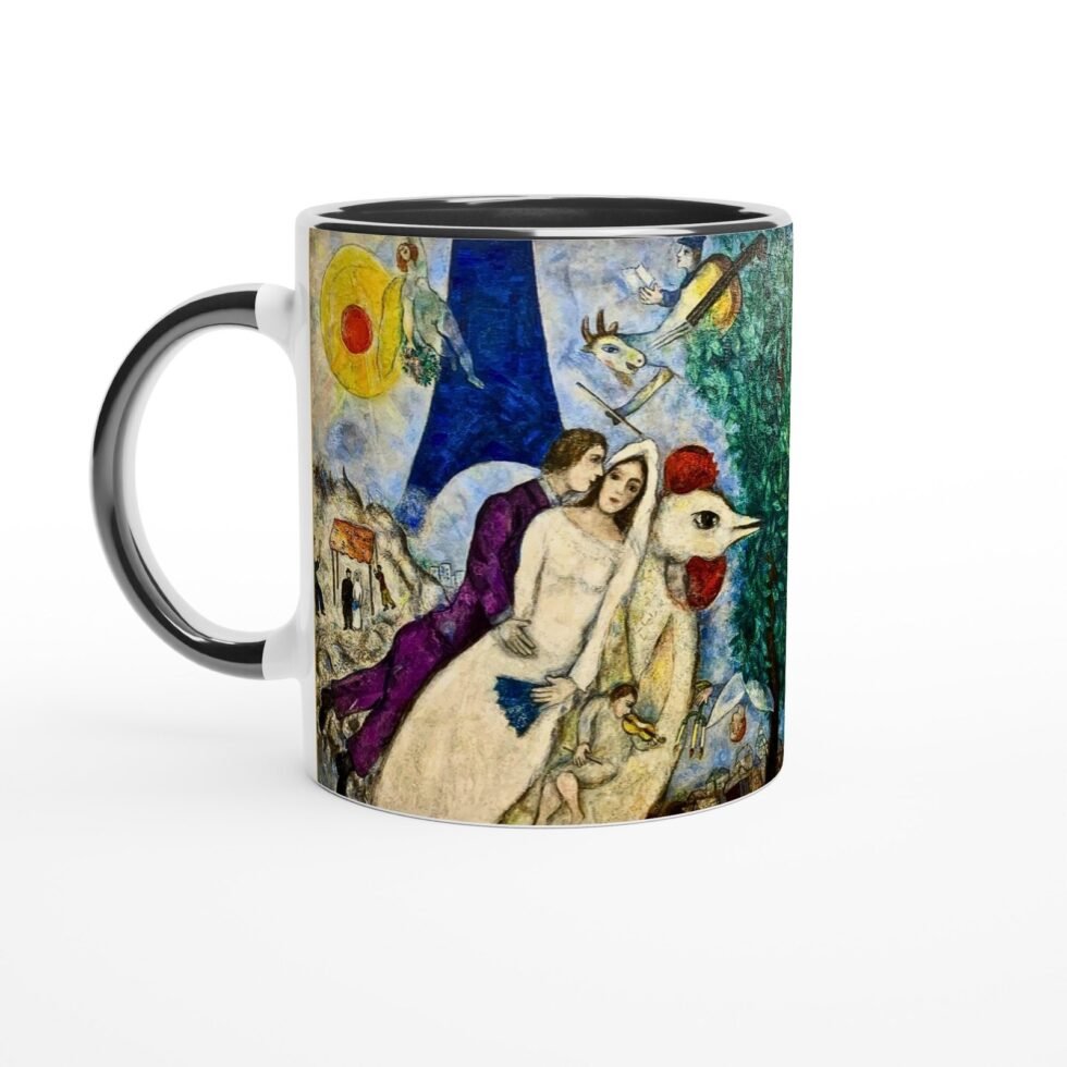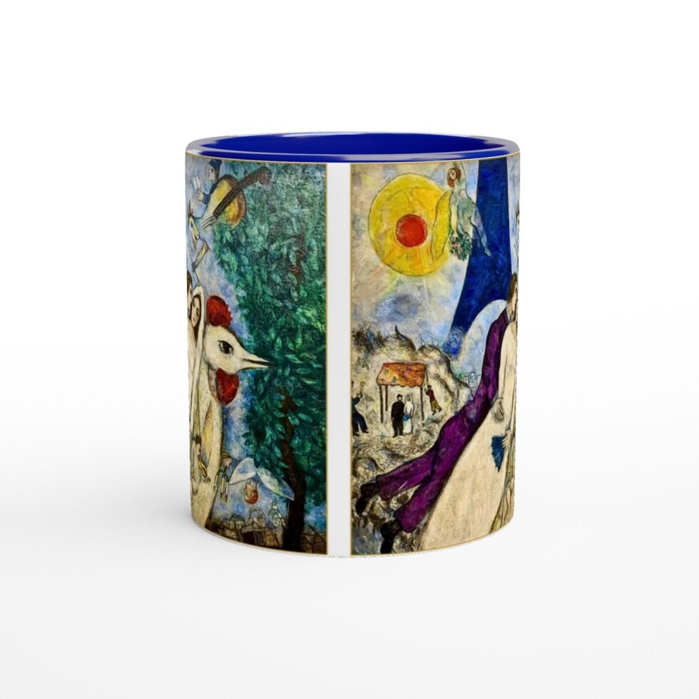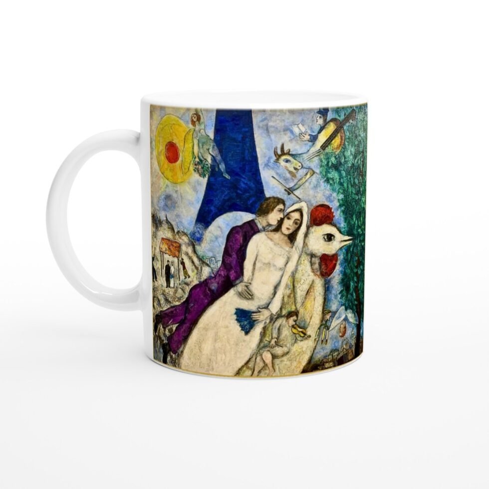 The illustration translates beautifully onto the mug’s surface, where soft radiance enhances warmth and expressiveness. The colors remain rich and fluid, preserving the lyrical quality of Chagall’s brushwork while keeping the composition balanced and clear.