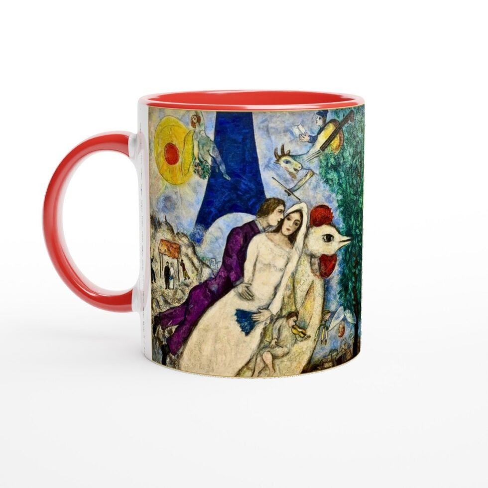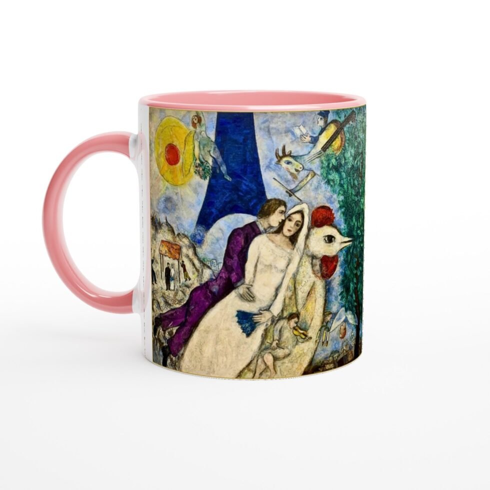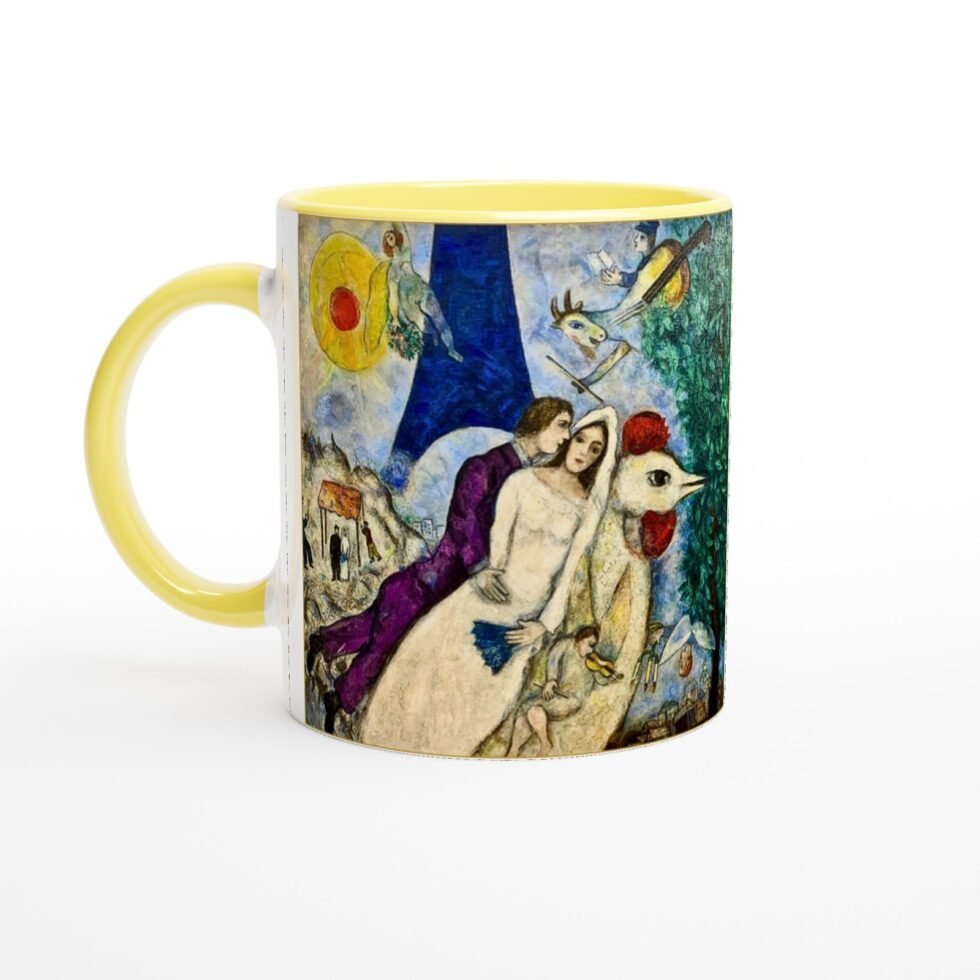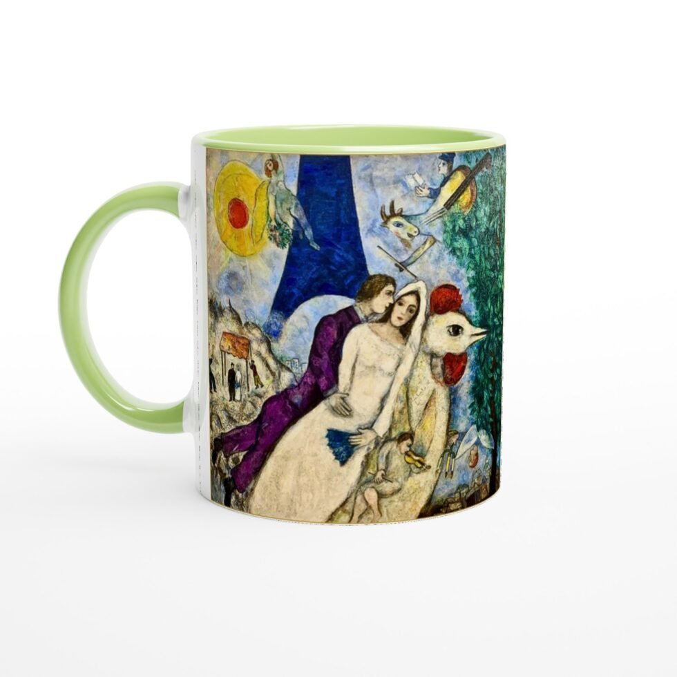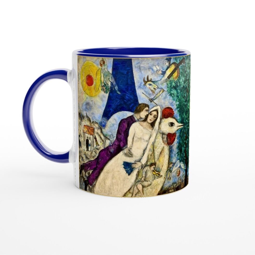 The illustration translates beautifully onto the mug’s surface, where soft radiance enhances warmth and expressiveness. The colors remain rich and fluid, preserving the lyrical quality of Chagall’s brushwork while keeping the composition balanced and clear.